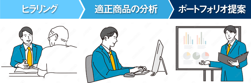 お客さまに合ったポートフォリオを構築するために、STEP02も含め最適な金融商品をご提案させていただきます。(当社が扱える範囲内でのご提案になります)